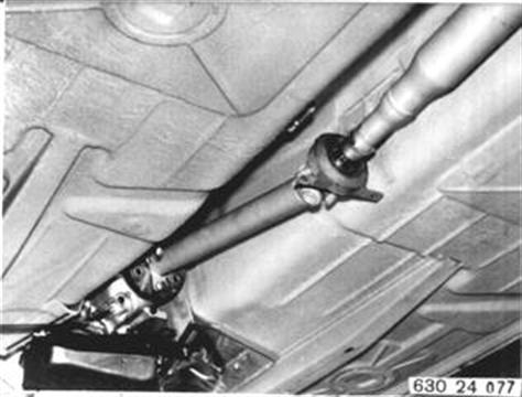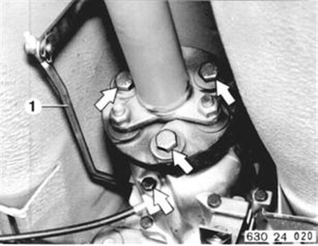 Schaltstange (1) abbauen. Tachowelle lösen. Gelenkscheibe vom Getriebe abbauen. Einbauhinweis: Stoppmuttern erneuern. | ![]() |