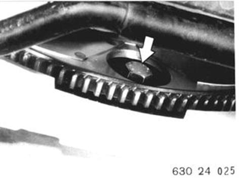 Einbauhinweis: Mitnehmerscheibe auf Bruchstellen und Rißbildung prüfen ggf. ersetzen. Nur bei Ersetzen Schwungrad mit Halter 11 2 160 blockieren. Dehnkopfschrauben lösen. Achtung! Dehnkopfschrauben ersetzen und mit Loctite Kenn-Nr. 270 einbauen. Gewindebohrungen einwandfrei säubern. |