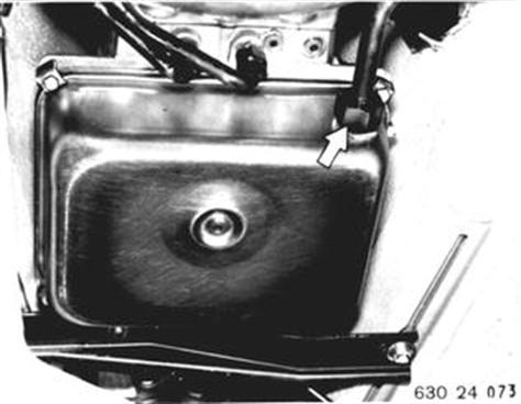 Fahrzeuge vor Modellwechsel 1982 ÖLWANNE AUS- UND EINBAUEN Öl ablassen. Achtung! Abgelassenes Öl nicht mehr verwenden. Öl auffüllen nur mit Trichter 24 0 080. Einbauhinweis: Hat das Öl einen verbrannten Geruch und eine schwärzliche Färbung, muß das Getriebe zerlegt werden. Ist das Öl grauschillernd, handel es sich um Aluminium- bzw. Eisenabrieb. Fahrzeug auf ebenen Untergrund stellen. Ölstand in Wählhebelstellung P bei betriebswarmem Getriebe im Motorleerlauf ergänzen. Der Ölstand muß bei betriebswarmem Getriebe zwischen den den beiden Markierungen liegen. Ölmenge zwischen min. und max. Markierung: Flache Ölwanne ca. 0,25l (Ölmeßstab schwarze Grifföse) Tiefe Ölwanne ca. 0,4 l (Ölmeßstab gelbe Grifföse). Ölmeßstab nicht mit faserndem Lappen reinigen. Ölstand zu hoch: Starke Schaumbildung, Panschverluste, Temperaturerhöhung bei schneller Fahrt. Ölverlust über den Entlüfter. Ölstand zu nieder: Ventilschnattern, Motor dreht bei Kurvenfahrt durch, allgemeine Funktionsstörung. Öleinfüllrohr von der Ölwanne lösen. Ölwanne abbauen. Einbauhinweis: Ölwanne nit den Haltewinkeln so befestigen, daß kurzer Schenkel auf die Ölwanne drückt.