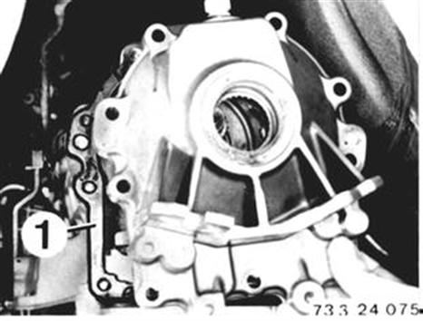 Fahrzeuge nach Modellwechsel 1982 GETRIEBEVERLÄNGERUNG AUS- IMD EINBAUEN/ABDICHTEN Gelenkwelle abbauen siehe 24 00 022. Sicherungsblech (1) ausheben. Einbauhinweis: Sicherungsblech erneuern. 24 00 022