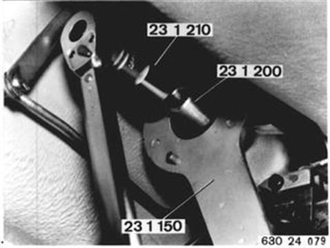 Abtriebsflansch mit Halteschlüssel 23 1 150 gegenhalten. Führungsbüchse 23 1 200 aufstecken. Mit Steckschlüssel - Einsatz 23 1 210 Bundmutter¹) lösen. Abtriebsflansch abziehen. Einbauhinweis: Bundmutter mit Curil K 2 oder Loctite 572 einsetzen. ¹) Anziehdrehmoment siehe technische Daten