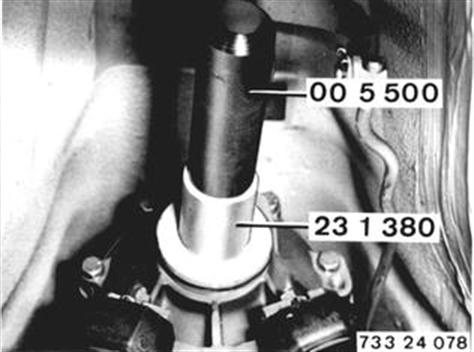 Dichtlippe mit ATF-Öl einölen. Radialdichtring mit Schlagbüchse 23 1 380 in Verbindung mit Griff 00 5 500 eintreiben. Radialdichtring für Drehmomentwandler ersetzen siehe Baugruppe Rep.-Anleitung MF 24 12... | ![]() |