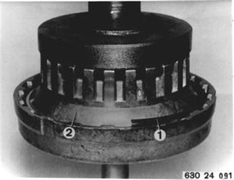 Fahrzeuge vor Modellwechsel 1982 LAMELLEN-KUPPLUNGEN UND - BREMSEN ERSETZEN Getriebe zerlegen 24 00 080. Kupplung A Kupplungspaket zusammendrücken und Sprengring (1) ausheben. Lamellenträger (2) abnehmen. 24 00 080