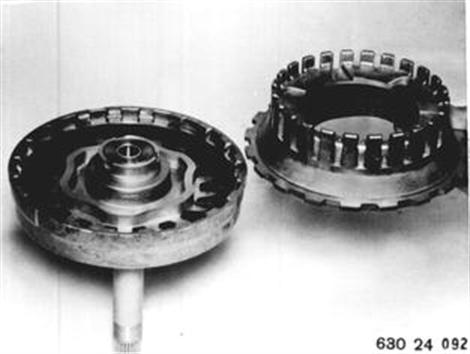Außenlamellen (6), Belaglamellen (7) und Freilauf (8) für 2. Gang herausnehmen. Einbauhinweis: Den Freilauf (8) so einbauen, daß die umgebogenen Lappen des Haltebleches oder sichtbar sind. Einbaureihenfolge der Lamellen: 6 Außenlamellen - 2 Stück 7 Belaglamellen - 2 Stück Neue Belaglamellen ca. 20 Min. in 70°C warmes ATF-Öl legen. | |