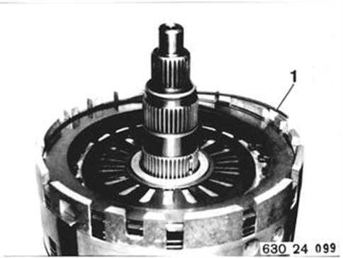 Kupplung B Sprengring (1) ausfedern. Außen- und Belaglamellen herausnehmen. | |