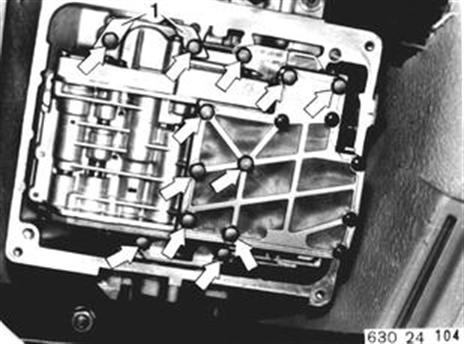 Fahrzeuge vor Modellwechsel 1982  SCHALTGERÄT AUS- UND EINBAUEN Ölwanne abbauen 24 11 000. Schaltgerät ausbauen. Einbauhinweis: Anziehdrehmoment¹). Nur wenn Stützbleche vorhanden: Stützbleche (1) mit befestigen.  24 11 000  ¹) Siehe technische Daten |  |