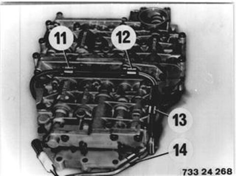Fahrzeuge nach Modellwechsel 1982  KABELBAUM FÜR AUTOMATIKGETRIEBE ERSETZEN Schaltgerät ausbauen 24 30 002. Steckhülsen des Kabelsbaums von den Magnetventilen (1...4) vom Druckregler (5) und vom Impulsgeber (6) abziehen. Kabelbaum aus den Kabelklemmen ausheben. Einbauhinweis: Kabelfarbe beachten: Magnetventil (1) GR/VI Magnetventil (2) GN/VI Magnetventil (3) RT/VI Magnetventil (4) OR/VI Magnetventil (5) BL/VI Magnetventil (6) BR/BR Steckhülsen bis zum Anschlag aufschieben und auf festen Sitz achten. l  24 30 002 |  |