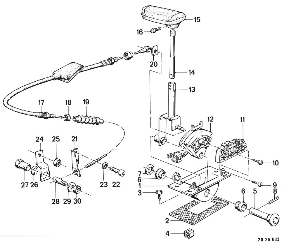 SCHALTANORDNUNG BEI AUTOMATIKGETRIEBE: - AUSFÜHRUNG MIT SEILZUG - 1 Lagertopf 2 Dichtplatte 3 Blechschraube 4 Blechmutter 5 Lagerbolzen 6 Lagerbüchse 7 Paßscheibe 8 Spannstift 9 Blechschraube 10 Blechschraube 11 Schaltkulisse 12 Getriebeschalter 13 Wählhebel 14 Zugstange 15 Griff 16 Gewindestift 17 Bowdenzug 18 Mutter 19 Faltenbalg 20 Sicherung 21 Haltebügel 22 Schraube 23 Federscheibe 24 Getriebehebel 25 Mutter 26 Scheibe 27 Büchse 28 Klemmbolzen 29 Scheibe 30 Mutter |  |
