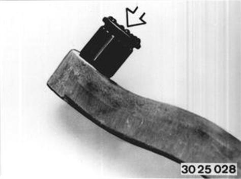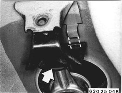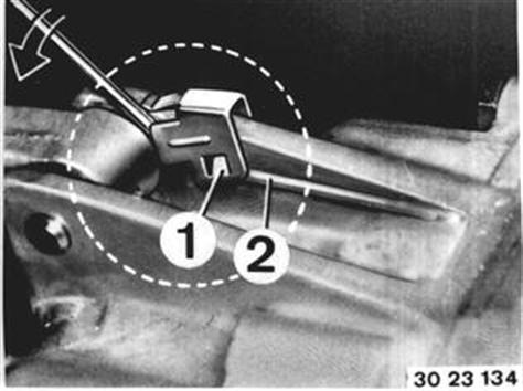 Clip von Lagerbolzen ausheben. Hinweis: Der Clip ist mit einem Schraubenzieher zugänglich. Durch drehen Clip (1) aus Haltenase (2) aushängen und hochschwenken. |  |