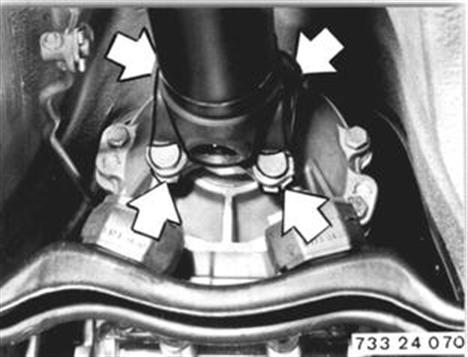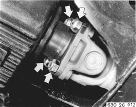 GELENKWELLE AUS- UND EINBAUEN Spannband 26 1 011 anlegen. Schrauben lösen. Einbauhinweis: Stoppmutter nur einmal verwenden. |  |