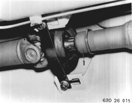 Gelenkwelle nach unten knicken und aus  Zentrierzapfen am Getriebe herausziehen. Einbauhinweis: Die Gelenkwelle ist im Strang gewuchtet und darf nur kompl. ersetzt werden. |  |