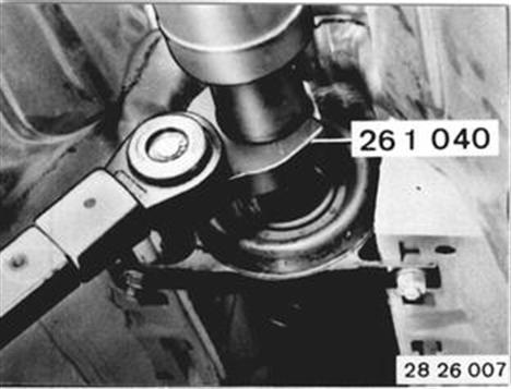 MITTELLAGER AUS- UND EINBAUEN Spannband 26 1 011 anlegen. Schrauben lösen. Einbauhinweis: Stoppmuttern nur einmal verwenden. | ![]() |