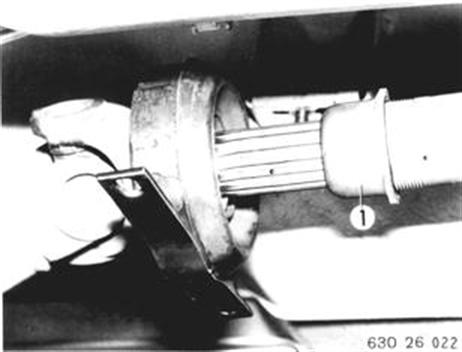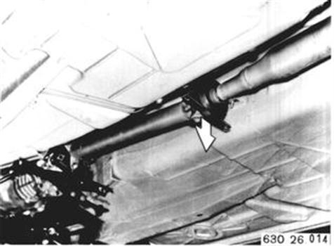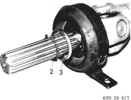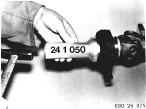 Fahrzeuge nach Modellwechsel 1982 GELENKWELLEN-MITTEL-LAGER KOMPL. ERSETZEN Gelenkwelle ausbauen 26 11 000. Schraubbüchse mit Werkzeug 26 1 040 abschrauben. Vordere Gelenkwellenhälfte abziehen. Achtung! Die Gelenkwelle ist im Strang gewuchtet und darf im Schiebestück nicht verdreht werden. Nicht gezeigte Gelenkwelle durch Körner zeichnen. 26 11 000