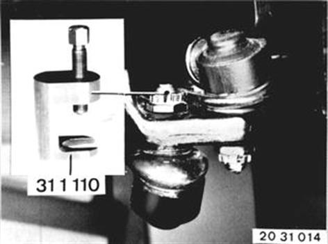 Kronenmutter entsplinten und lösen. Kugelgelenk mit Werkzeug 31 1 110 abdrücken. Einbauhinweis: Kugelzapfen und Bohrungen frei von Fett und Schmutz. Anziehdrehmoment*). Mutter mit Splint sichern. *) Siehe Technische Daten Gr. 31/32