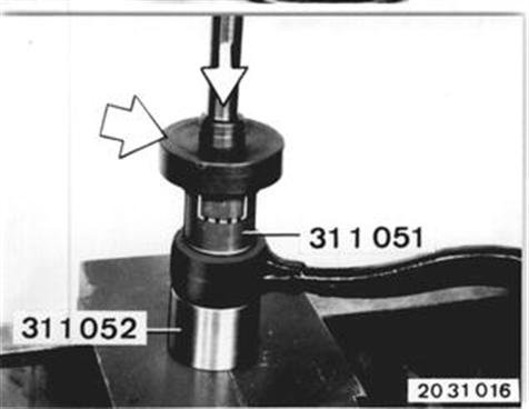Bei ausgebautem Querlenker: Mit einer Presse und Werkzeug 31 1 051 / 052 Gummilager aus- und einpressen. | ![]() |