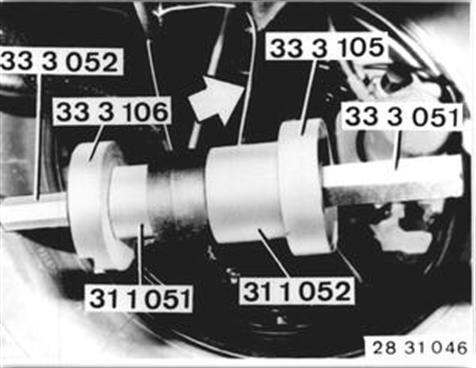 Querlenker mit Draht hochbinden (verhindert eine Beschädigung des Kugelgelenkes). Gummilager mit Werkzeug 31 1 051 / 052 und 33 3 051 / 052 / 105 /106 ausziehen. Einbauhinweis: Gummilager und Querlenker-Bohrung frei von Fett. Gummilager von der am Querlenker angeschrägten Seite einziehen. | ![]() |