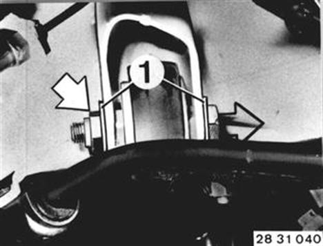 Fahrzeuge nach Modellwechsel 1982  GUMMILAGER IN DRUCKSTREBE LINKS ODER RECHTS ERSETZEN Schraube lösen. Einbauhinweis: 1 = Scheibe beidseitig - selbstsichernde Mutter erneuern - Anziehdrehmoment*) in Normallage*). Achtung! Grundsätzlich beide Lager erneuern.  *) Siehe Technische Daten |  |