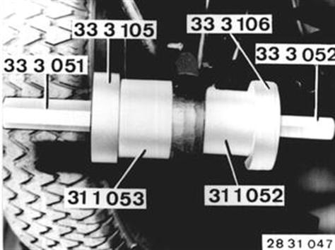 Gummilager mit Werkzeug 31 1 052 / 053 und  33 3 051 / 052 / 105 / 106 ausziehen. |  |