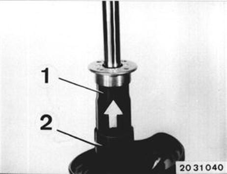 Aufnahme (1) und Zusatzfeder mit Schutzrohr von der Kolbenstange abziehen. | ![]() |
