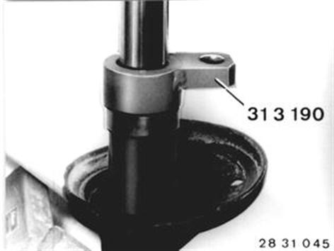 Schraubenfeder mit Federspanner 31 3 111 zusammendrücken. Achtung! Bolzen von Stützlager und Werkzeug 31 3 116 müssen in den Aussparungen liegen. | ![]() |