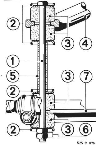 1 Schraube M 8 x 160 2 Tellerscheibe 3 Gummiring 4 Stabilisator 5 Abstandsrohr 6 Muttern M 8 7 Querlenker |  |