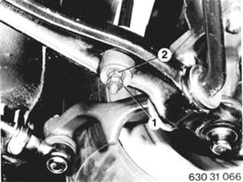Neue Ausführung: Kontermutter (1) und Befestigungsmutter (2) der Gummilagerungen am Querlenker links und rechts lösen. |  |