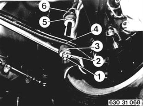 Fahrzeuge vor Modellwechsel 1982  STABILISATOR AUS- UND EINBAUEN ODER ERSETZEN Alte Ausführung: Kontermutter (1) und Befestigungsmutter (2) der Gummilagerungen am Querlenker links und rechts lösen und Gummiringe (3 ... 6) abziehen. |  |