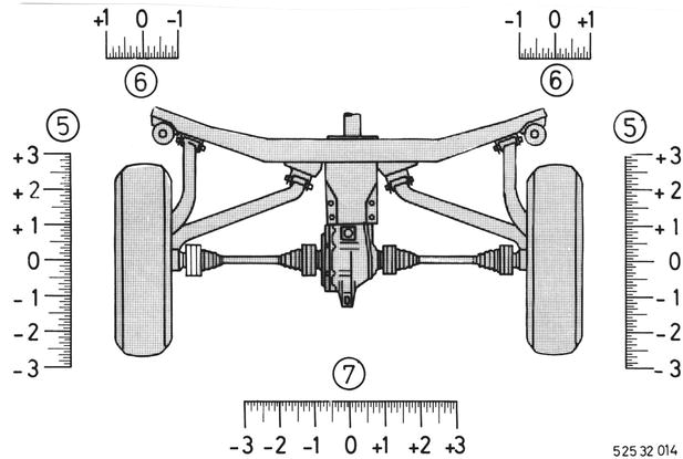Fahrzeuge vor Modellwechsel 1982  HINTERACHSE OPTISCH VERMESSEN Folgende Forderungen müssen vor der Radvermessung erfüllt sein: 1. Gutes gleichmäßiges Reifenprofil 2. Vorgeschriebener Reifenluftdruck¹) 3. Einwandfreie Felgen 4. Vorschriftsmäßiges Radlagerspiel 5. Fahrzeug in Normallage bringen:¹) Mit optischem Meßgerät Istwerte ermitteln.  ¹) Siehe technische Daten |  |