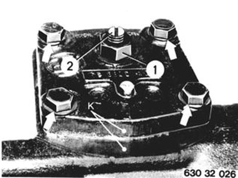 Deckel-Druckpunkt: Deckel zum Gehäuse mit Körnerschlag (K) zeichnen. Mutter (1) abschrauben, dabei Schraube (2) gegenhalten. Befestigungsschrauben für Deckel lösen. Einbauhinweis: Anziehdrehmoment¹).  ¹) Siehe technische Daten |  |