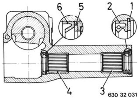 Seegerring (1) und Radialdichtring (2) ausheben. Nadellager (3) ausziehen. Nadellager (4) mit Stützscheibe (5) und Dichtring (6) austreiben. Einbauhinweis: Dichtlippen der Dichtringe (2 und 6) zeigen zum Gehäuse innen. |  |