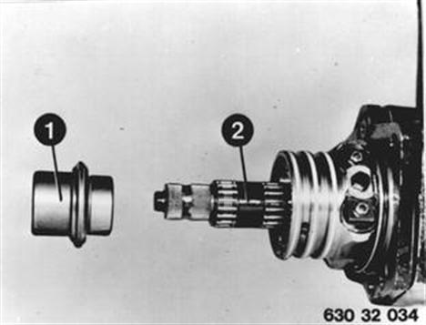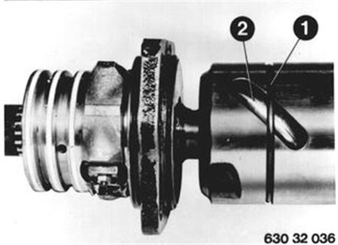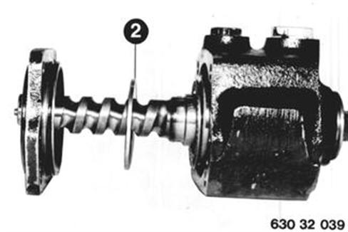 Schnecke aus Kolben herausdrehen. Achtung! Kugeln. Zwischendeckel abnehmen. Sprengring (1) ausheben und Umlaufrohr (2) abnehmen. |  |