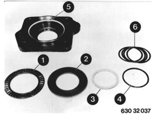 Nadelkäfig (1), Lagerscheibe (2), Nutring (3), O-Ring (4) und Teflonring (5) überprüfen. Einbauhinweis: Wahlweise 0 ... 4 Ausgleichscheiben (6) beilegen. Die Anzahl der Scheiben so auswählen, daß die Dichtlippe vom Nutring (3) Vorspannung hat. Das vorgeschriebene max. Reibmoment¹) darf nicht überschritten werden.  ¹) Siehe technische Daten |  |