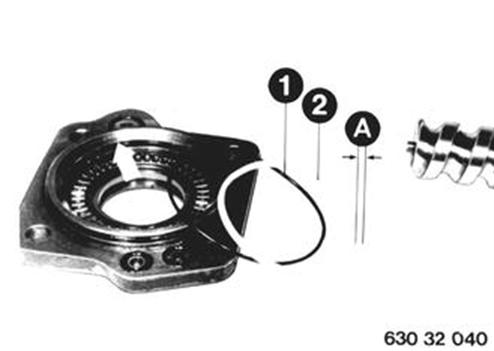 Vorspannung des Teflonringes im Zwischendeckel prüfen. Lagerscheibe und Nadelkäfig in den Zwischendeckel legen. O-Ring (1) und Teflonring (2) - A = 1,7 mm - in die Nut einlegen. |  |