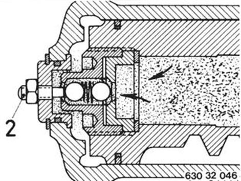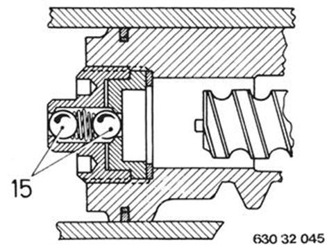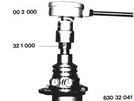 Schnecke ca. 3 1/2 Umdrehungen herausdrehen. Mit Aufsatz 32 1 000 und Reibwertmesser 00 2 000 in waagrechter Lage über einen Bereich von mindestens 90° Reibwert¹) ermitteln. Reibwert wird vom Kugeldurchmesser bestimmt. Achtung! Es dürfen nur Kugeln mit gleichen Durchmessern - Toleranzgruppen - verwendet werden. Nach erfolgter Reibwerteinstellung Schnecke ausbauen. Zwischendeckel einbauen und Schnecke mit Kolben zusammenbauen. Achtung! Schnecke niemals weiter als 3 1/2 Umdrehungen herausdrehen, sonst können Kugeln in die Kolbenbohrung fallen.  ¹) Siehe technische Daten |  |