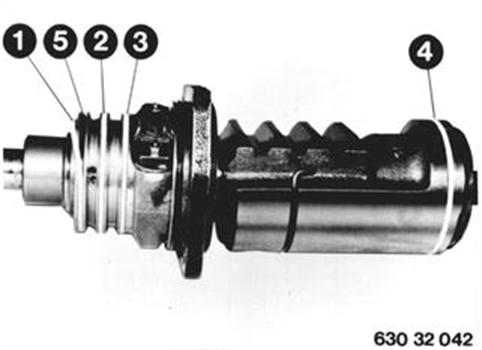 Teflonring, Schneckenkopf, Kolben: Teflonringe (1 ... 4) mit einer Blattlehre aus Schneckenkopf und Kolben heben. O-Ring (5) herausnehmen. Einbauhinweis: Ausgebaute Ringe ersetzen. |  |