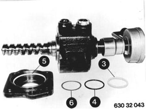 Zwischendeckel: Schnecke mit Zwischendeckel und Kolben aus Gehäuse ziehen. Einbauhinweis: Dichtringe (1 ... 4) überprüfen, ggf. ersetzen. |  |