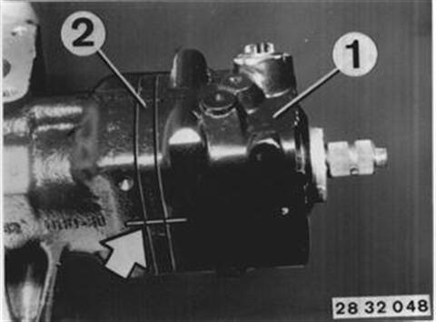 Lenkung an eine Endstellung drehen. Ca. 2 Umdrehungen zurückdrehen bis Markierung auf Spindel und Gehäuse übereinstimmt = Geradeausfahrtstellung. | ![]() |
