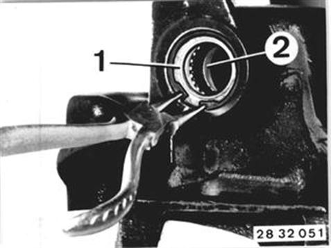 Sicherungsring ausheben. Äußeren Radialdichtring (1) und inneren Radialdichtring (2) herausdrücken. | ![]() |