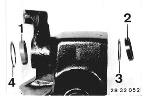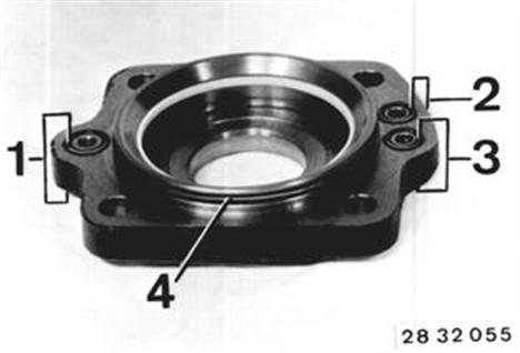 Lippen der Radialdichtringe fetten. Stützring (3) einlegen und Radialdichtring (2) (Lippen zum Gehäuseinneren) mit Werkzeug 32 1 060 eindrücken. Radialdichtring (1) mit Werkzeug 32 1 070 eindrücken (Lippe zum Gehäuseinneren) und Sicherung (4) einsetzen. | ![]() |