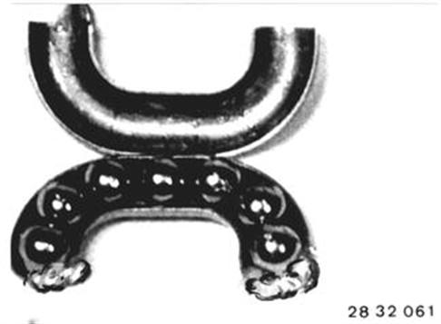 Schneckenkopf in den Kolben schieben A = ca. 6 cm. Durch die Bohrung (1) 16 Kugeln in den Gewindegang der Schnecke einfüllen, dabei die Schnecke weiterdrehen bis die Kugeln zur Bohrung (2) mitgeführt sind. | ![]() |
