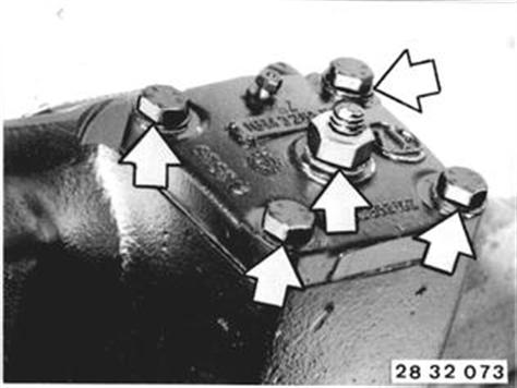 Fahrzeuge nach Modellwechsel 1982 RADIALDICHTRING FÜR SEGMENTWELLE UND LENKSCHNECKE ERSETZEN UND ZWISCHENDECKEL ABDICHTEN - Hydrolenkgetriebe ausgebaut - Bei der Montage des Lenkgetriebes ist auf äußerste Sauberkeit zu achten! Hydrolenkgetriebe Kenn-Nr. 8052... ... Sicherungsblech aufbiegen und Mutter lösen. Einbauhinweis: Sicherungsblech erneuern - Anziehdrehmoment*) - sichern. | ![]() |