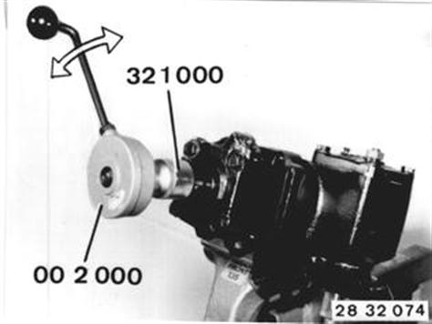Druckpunkt-Einstellung: Werkzeug 32 1 000 auf der Spindel befestigen und Reibmomentmesser 00 2 000 aufstecken. Reibmoment ca. 1/2 Umdrehung vor Endanschlag messen. Lenkgetriebe in Geradeausfahrtstellung bringen. Nachstellschraube verdrehen bis beim "Überfahren" des Druckpunktes eine Reibmomenterhöhung von 40 - 50 Ncm gegenüber dem vorher ermittelten Reibmoment gemessen wird. Das Gesamt-Reibmoment darf 160 Ncm nicht übersteigen. Kontermutter mit 25 Nm kontern. Reibmoment nochmals überprüfen. Lenkstockhebel anbauen. Nach dem Einbau des Lenkgetriebes Funktionsprüfung druchführen. | ![]() |