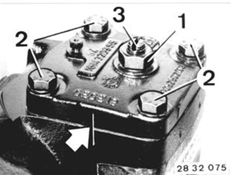 Deckel zum Gehäuse zeichnen. Mutter (1) lösen. Schrauben (2) lösen und durch Daten der Nachstellschraube (3) Deckel abheben. | ![]() |