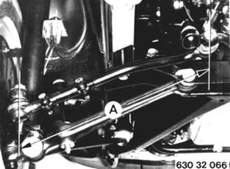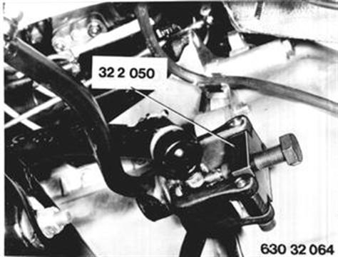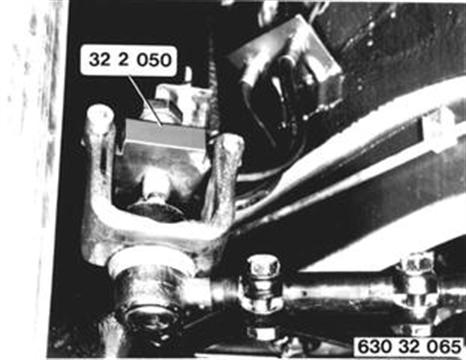 Fahrzeuge vor Modellwechsel 1982  SPURSTANGE LINKS ODER RECHTS ERSETZEN Kronenmutter entsplinten und lösen. Spurstange außen von mittlerer Spurstange mit Abdrücker 32 2 050 abdrücken. Einbauhinweis: Anziehdrehmoment¹). Kronenmutter mit Splint sichern. Vorderachse optisch vermessen 32 00 034.  ¹) Siehe technische Daten  32 00 034 |  |