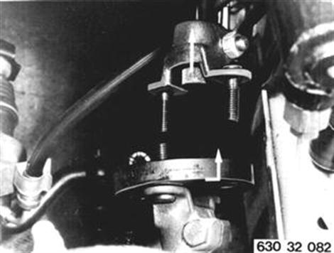 Lenkspindel nach oben schieben und Gelenkscheibe abnehmen. Einbauhinweis: Lenkrad und Vorderräder in Geradeausfahrtstellung. Markierungen an Gehäuse und Lenkwelle müssen sich decken. |  |