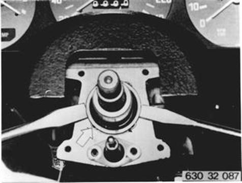 Fahrzeuge vor Modellwechsel 1982  LENKSPINDELLAGER ERSETZEN Massekabel von Batterie abklemmen. Lenkrad aus- und einbauen 32 33 000. Verkleidung-Unterteil aus- und einbauen 32 31 020. Blinker- und Wisch-Wasch-Schalter von der Schalterplatte lösen. Rückstellnocken abnehmen. Einbauhinweis: Siehe Rückstellnocken ersetzen 32 31 131.  32 33 000  32 31 020  Siehe technische Daten |  |
