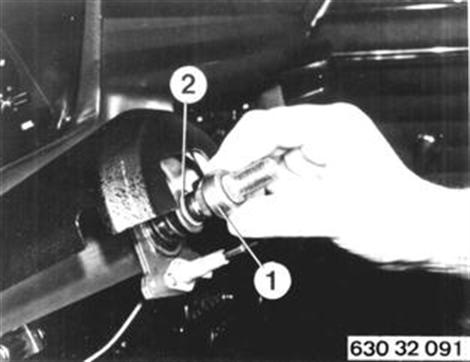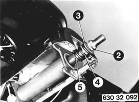 Sprengring (2), Scheibe (3), Druckfeder (4) und Ring (5) abnehmen. Einbauhinweis: Der Schaft des Ringes (5) muß zum Lenkspindellager zeigen. Sprengring (2) mit Hülse 32 3 050 montieren. |  |