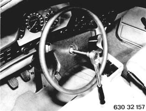 Mutter lösen und Lenkrad abnehmen. Einbauhinweis: Lenkrad in Geradeausfahrstellung - Markierung an Lenkgehäuse und Lenkwelle müssen sich gegenüber stehen - einbauen. Anziehdrehmoment¹). Selbstsichernde Mutter erneuern.  ¹) Siehe technische Daten |  |