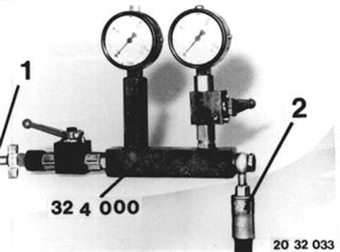 Druckabbau: Bei stehendem Motor Bremspedal ca. 20 mal betätigen. Druckmesser 32 4 000 zwischen Pumpe und DS-Regler einbauen. 1 = Anschluß DS-Regler bzw. Lenkgetriebe 2 = Anschluß Pumpe