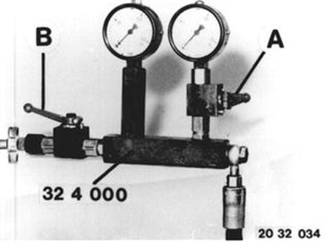 A= Absperrventil (Niederdruck 0 - 15 bar) Achtung! Absperrventil (A) muß bei Hockdruckmessungen immer geschlossen sein - Druckmesserbeschädigung. B = Absperrventil (Hochdruck 0 - 150 bar) Ventil (B) öffnen. Ventil (A) schließen. Motor starten - Hydraulikflüssigkeit**) im Behälter auffüllen. System entlüften: Lenkrad je 2 mal nach links und rechts bis zum Anschlag drehen. Bremspedal 5 mal betätigen, 30 sec. warten und noch 5 mal betätigen. Bei allen Messungen muß die Hydraulikflüssigkeits- Temperatur ca. 50° C betragen. Temperatur ggf. durch Lenkeinschläge bei laufendem Motor erhöhen. 1. Durchlauf prüfen: Ventil (B) offen. Ventil (A) geschlossen und Motor läuft. Bei einem Druck kleiner 15 bar Ventil (A) öffnen und Druck ablesen. Der max. zulässige Durchlaufdruck von 8 bar darf nicht überschritten werden. Bei einem Druck größer 8 bar: **) Siehe Service-Information Gr. 00